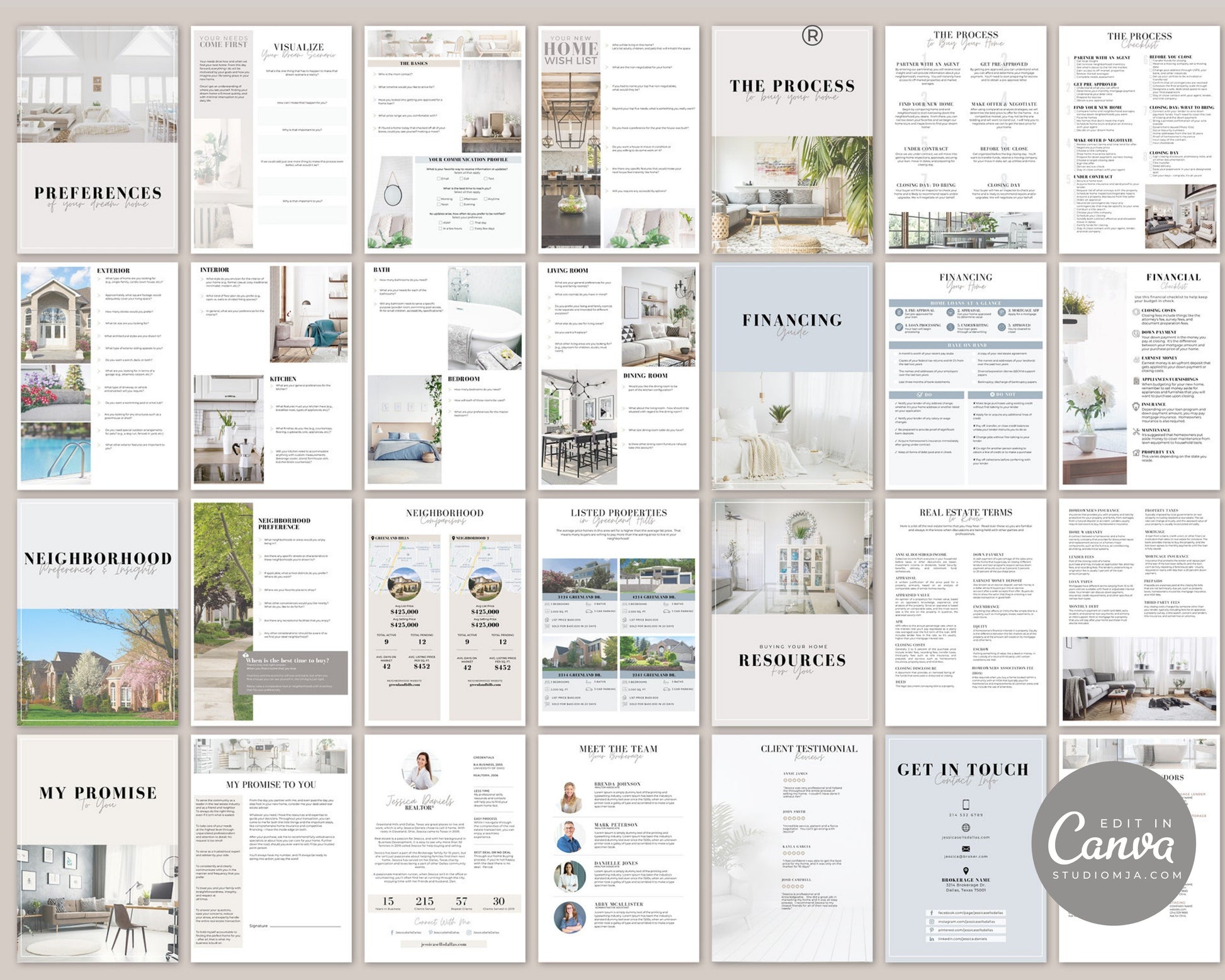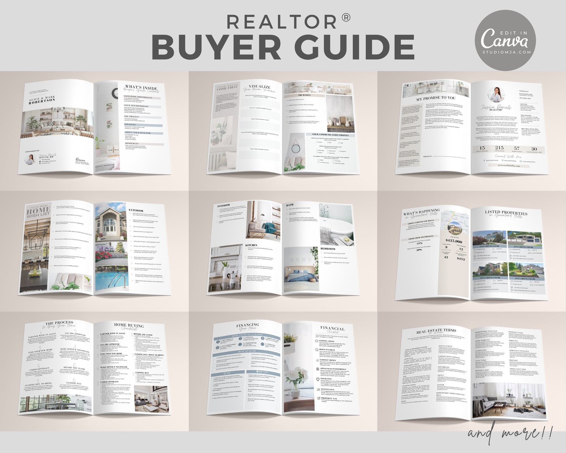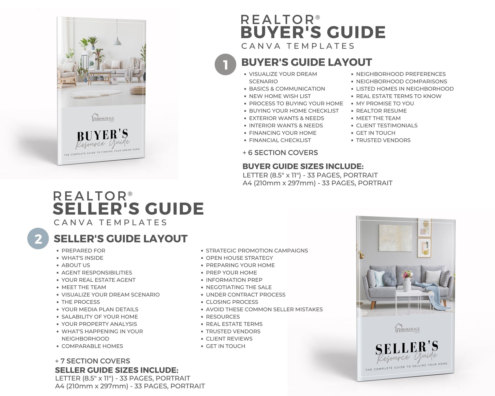 Matching buyer and seller guides to complete your Real Estate branding. Guide your buyers and sellers throughout the sale process, and provide them with resources to ensure a smooth close ever time. A buyer guide for your Real Estate clients to guide them through the home buying process. These guides are easily editable in Canva!