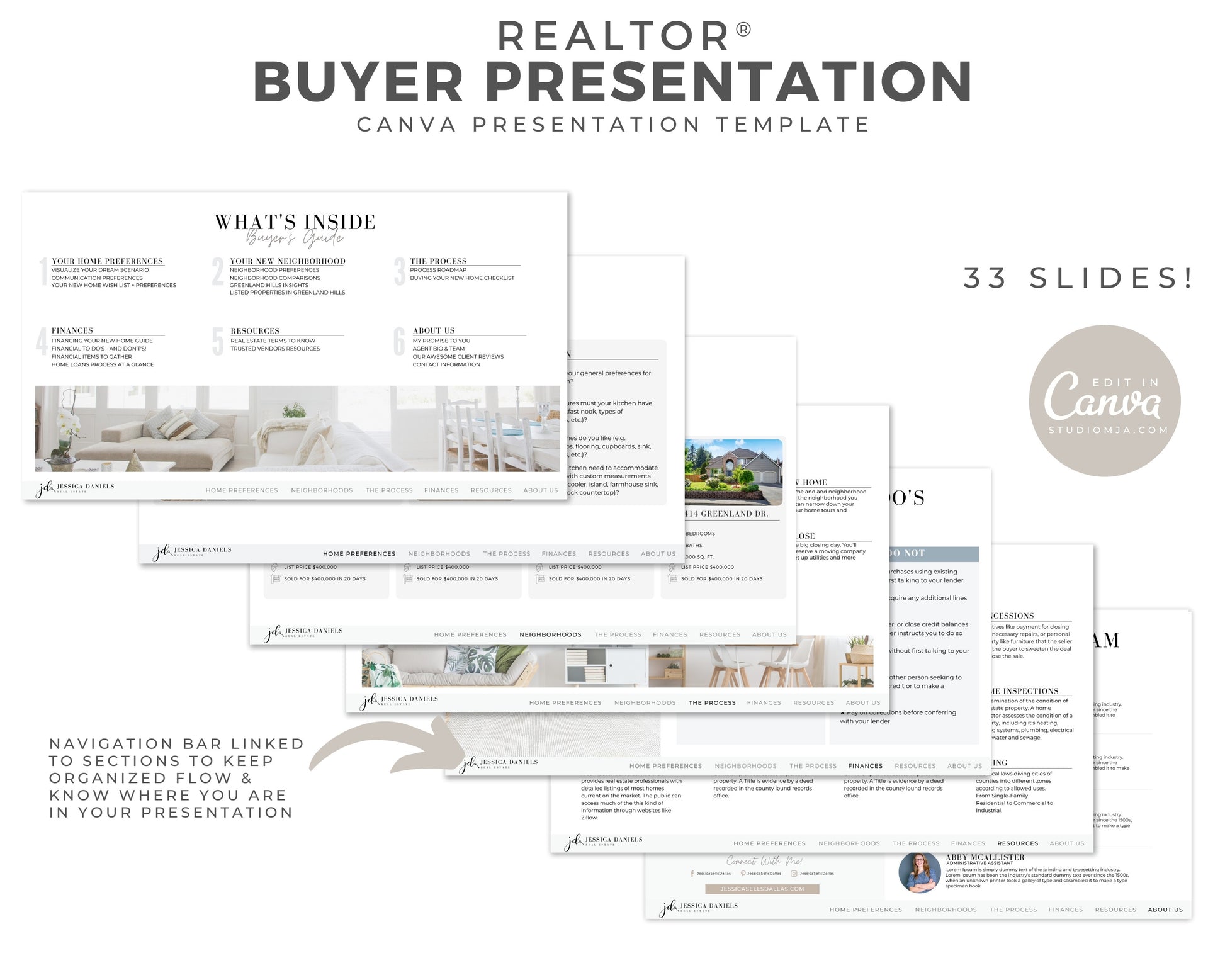 Have your go to presentations, guides and brochures ready to close on buyers and seller's. The presentations can be presented via Canva with fully animated slides and a bottom static navigation to keep your flow and presentation organized.